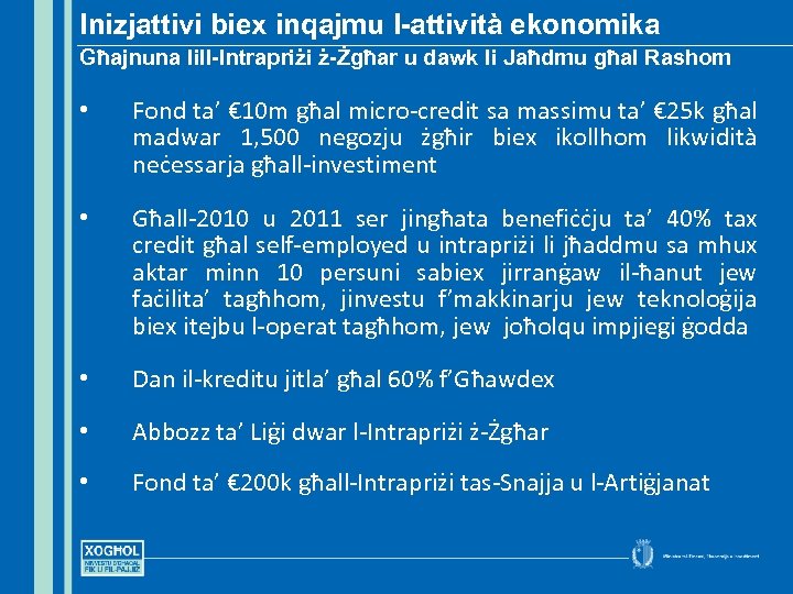 Inizjattivi biex inqajmu l-attività ekonomika Għajnuna lill-Intrapriżi ż-Żgħar u dawk li Jaħdmu għal Rashom • Fond ta’ € 10 m għal micro-credit sa massimu ta’ € 25 k għal madwar 1, 500 negozju żgħir biex ikollhom likwidità neċessarja għall-investiment • Għall-2010 u 2011 ser jingħata benefiċċju ta’ 40% tax credit għal self-employed u intrapriżi li jħaddmu sa mhux aktar minn 10 persuni sabiex jirranġaw il-ħanut jew faċilita’ tagħhom, jinvestu f’makkinarju jew teknoloġija biex itejbu l-operat tagħhom, jew joħolqu impjiegi ġodda • Dan il-kreditu jitla’ għal 60% f’Għawdex • Abbozz ta’ Liġi dwar l-Intrapriżi ż-Żgħar • Fond ta’ € 200 k għall-Intrapriżi tas-Snajja u l-Artiġjanat