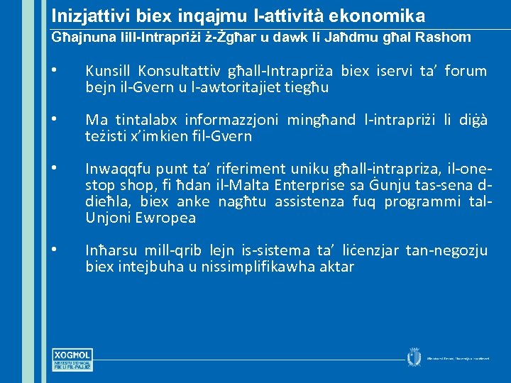 Inizjattivi biex inqajmu l-attività ekonomika Għajnuna lill-Intrapriżi ż-Żgħar u dawk li Jaħdmu għal Rashom • Kunsill Konsultattiv għall-Intrapriża biex iservi ta’ forum bejn il-Gvern u l-awtoritajiet tiegħu • Ma tintalabx informazzjoni mingħand l-intrapriżi li diġà teżisti x’imkien fil-Gvern • Inwaqqfu punt ta’ riferiment uniku għall-intrapriza, il-onestop shop, fi ħdan il-Malta Enterprise sa Ġunju tas-sena ddieħla, biex anke nagħtu assistenza fuq programmi tal. Unjoni Ewropea • Inħarsu mill-qrib lejn is-sistema ta’ liċenzjar tan-negozju biex intejbuha u nissimplifikawha aktar