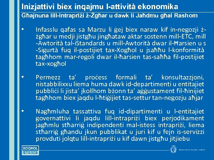 Inizjattivi biex inqajmu l-attività ekonomika Għajnuna lill-Intrapriżi ż-Żgħar u dawk li Jaħdmu għal Rashom • Infasslu qafas sa Marzu li ġej biex naraw kif in-negozji żżgħar u medji jistgħu jingħataw aktar sostenn mill-ETC, mill -Awtorità tal-i. Standards u mill-Awtorità dwar il-Ħarsien u s -Sigurtà fuq il-postijiet tax-Xogħol u jsaħħu l-konformità tagħhom mar-regoli dwar il-ħarsien tas-saħħa fil-postijiet tax-xogħol • Permezz ta’ proċess formali ta’ konsultazzjoni, nistabbilixxu liema huma dawk id-departimenti u entitajiet pubbliċi li jista’ jkollhom bżonn ta’ aġġustament fil-ħinijiet tagħhom biex jaqdu l-ħtiġijiet tas-settur tan-negozju aħjar • Nagħmluha tassattiva fuq id-dipartimenti u l-entitajiet governattivi li jaqdu lill-intrapriżi biex perjodikament jagħmlu stħarriġ indipendenti mal-istess intrapriżi, liema stħarriġ għandu jkun pubblikat u juri kif u fejn is-servizzi provduti jolqtu lill-intrapriżi u kif dawn jistgħu jitjiebu