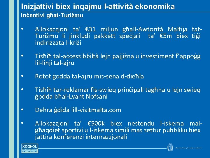 Inizjattivi biex inqajmu l-attività ekonomika Inċentivi għat-Turiżmu • Allokazzjoni ta’ € 31 miljun għall-Awtorità Maltija tat. Turiżmu li jinkludi pakkett speċjali ta’ € 5 m biex tiġi indirizzata l-kriżi • Tisħiħ tal-aċċessibbiltà lejn pajjiżna u investiment f’appoġġ lil-linji tal-ajru • Rotot ġodda tal-ajru mis-sena d-dieħla • Tisħiħ tar-reklamar fis-swieq prinċipali tagħna u lejn swieq ġodda bħal-Lvant Nofsani • Dehra ġdida lill-visitmalta. com • Allokazzjoni ta’ € 500 k biex nestendu l-iskema malgħaqdiet sportivi u l-iskema simili mas settur pubbliku biex jattira konferenzi internazzjonali