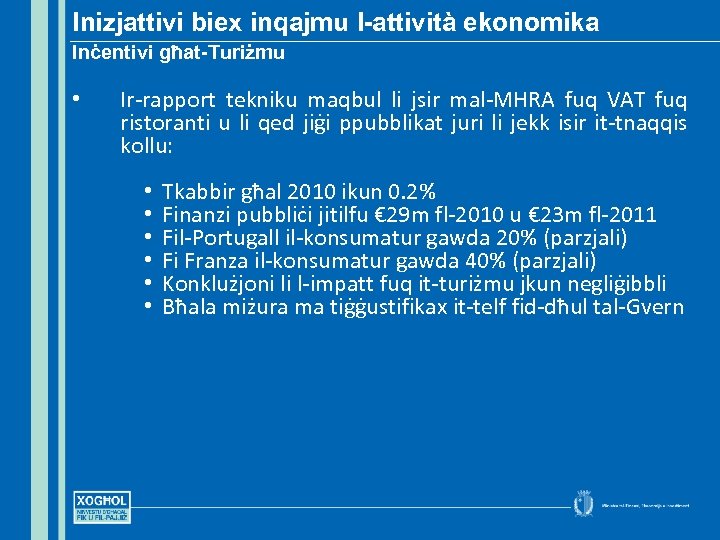 Inizjattivi biex inqajmu l-attività ekonomika Inċentivi għat-Turiżmu • Ir-rapport tekniku maqbul li jsir mal-MHRA fuq VAT fuq ristoranti u li qed jiġi ppubblikat juri li jekk isir it-tnaqqis kollu: • • • Tkabbir għal 2010 ikun 0. 2% Finanzi pubbliċi jitilfu € 29 m fl-2010 u € 23 m fl-2011 Fil-Portugall il-konsumatur gawda 20% (parzjali) Fi Franza il-konsumatur gawda 40% (parzjali) Konklużjoni li l-impatt fuq it-turiżmu jkun negliġibbli Bħala miżura ma tiġġustifikax it-telf fid-dħul tal-Gvern
