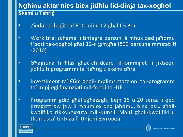 Ngħinu aktar nies biex jidħlu fid-dinja tax-xogħol Skemi u Taħriġ • Żieda tal-baġit tal-ETC minn € 2 għal € 3. 3 m • Work trial scheme li tintegra persuni li mhux qed jaħdmu f’post tax-xogħol għal 12 -il ġimgħa (500 persuna mmirati fl -2010) • Għajnuna fil-ħlas għaċ-childcare lill-ommijiet li jixtiequ jidħlu fi programmi ta’ taħriġ u skemi oħra • Investiment ta’ € 6 m għall-implimentazzjoni tal-programm ta’ impjiegi finanzjati mil-fondi tal-UE • Programm ġdid għal żgħażagħ, bejn 16 u 20 sena, li qed jirreġisttraw jew li mhumiex qed jaħdmu, biex jaslu għallkwalifika rikkonoxxuta mill-Kunsill Malti għall-Kwalifiki u tkun tista’ tintuża fl-Unjoni Ewropea