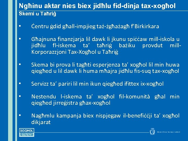 Ngħinu aktar nies biex jidħlu fid-dinja tax-xogħol Skemi u Taħriġ • Ċentru ġdid għall-impjieg taż-żgħażagħ f’Birkirkara • Għajnuna finanzjarja lil dawk li jkunu spiċċaw mill-iskola u jidħlu fl-iskema ta’ taħriġ bażiku provdut mill. Korporazzjoni Tax-Xogħol u Taħriġ • Skema bi prova li tagħti esperjenza ta’ xogħol lil min huwa qiegħed u lil dawk li huma mħajra jidħlu fis-suq tax-xogħol • Servizz ta’ pariri lil min ikun qiegħed ifittex ix-xogħol • Nestendu l-iskema ta’ xogħol fil-komunità għal min qiegħed jirreġistra għax-xogħol • Nagħmlu kampanja biex nispjegaw il-benefiċċji ta’ xogħol dikjarat