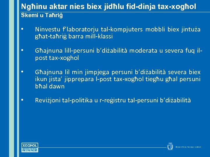 Ngħinu aktar nies biex jidħlu fid-dinja tax-xogħol Skemi u Taħriġ • Ninvestu f’laboratorju tal-kompjuters mobbli biex jintuża għat-taħriġ barra mill-klassi • Għajnuna lill-persuni b’diżabilità moderata u severa fuq ilpost tax-xoghol • Għajnuna lil min jimpjega persuni b’diżabilità severa biex ikun jista’ jipprepara l-post tax-xogħol tiegħu għal persuni bħal dawn • Reviżjoni tal-politika u r-reġistru tal-persuni b’diżabilità
