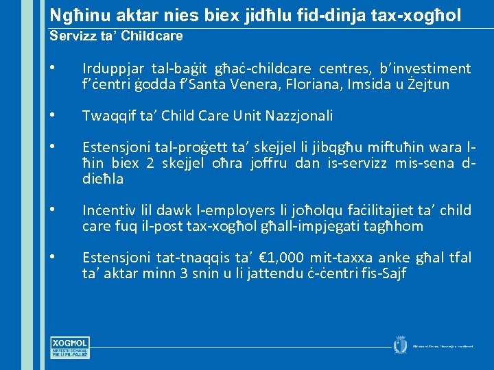 Ngħinu aktar nies biex jidħlu fid-dinja tax-xogħol Servizz ta’ Childcare • Irduppjar tal-baġit għaċ-childcare centres, b’investiment f’ċentri ġodda f’Santa Venera, Floriana, Imsida u Żejtun • Twaqqif ta’ Child Care Unit Nazzjonali • Estensjoni tal-proġett ta’ skejjel li jibqgħu miftuħin wara lħin biex 2 skejjel oħra joffru dan is-servizz mis-sena ddieħla • Inċentiv lil dawk l-employers li joħolqu faċilitajiet ta’ child care fuq il-post tax-xogħol għall-impjegati tagħhom • Estensjoni tat-tnaqqis ta’ € 1, 000 mit-taxxa anke għal tfal ta’ aktar minn 3 snin u li jattendu ċ-ċentri fis-Sajf