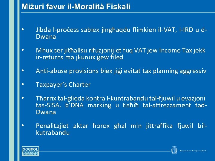 Miżuri favur il-Moralità Fiskali • Jibda l-proċess sabiex jingħaqdu flimkien il-VAT, l-IRD u d. Dwana • Mhux ser jitħallsu rifużjonijiet fuq VAT jew Income Tax jekk ir-returns ma jkunux ġew filed • Anti-abuse provisions biex jiġi evitat tax planning aggressiv • Taxpayer’s Charter • Tħarrix tal-ġlieda kontra l-kuntrabandu tal-fjuwil u evażjoni tas-SISA, b’DNA marking u tisħiħ tal-attrezzament tad. Dwana • Penalitajiet aktar ħorox għal min jittraffika fjuwil bilkutrabandu
