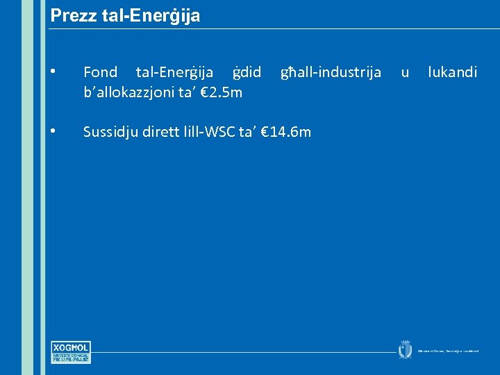 Prezz tal-Enerġija • Fond tal-Enerġija ġdid għall-industrija u lukandi b’allokazzjoni ta’ € 2. 5 m • Sussidju dirett lill-WSC ta’ € 14. 6 m