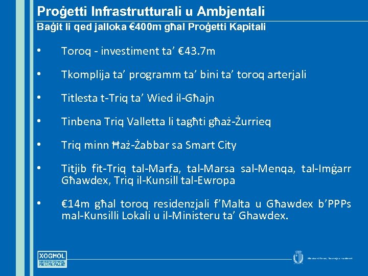 Proġetti Infrastrutturali u Ambjentali Baġit li qed jalloka € 400 m għal Proġetti Kapitali • Toroq - investiment ta’ € 43. 7 m • Tkomplija ta’ programm ta’ bini ta’ toroq arterjali • Titlesta t-Triq ta’ Wied il-Għajn • Tinbena Triq Valletta li tagħti għaż-Żurrieq • Triq minn Ħaż-Żabbar sa Smart City • Titjib fit-Triq tal-Marfa, tal-Marsa sal-Menqa, tal-Imġarr Għawdex, Triq il-Kunsill tal-Ewropa • € 14 m għal toroq residenzjali f’Malta u Għawdex b’PPPs mal-Kunsilli Lokali u il-Ministeru ta’ Ghawdex.