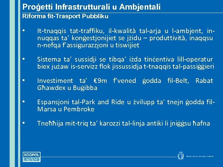 Proġetti Infrastrutturali u Ambjentali Riforma fit-Trasport Pubbliku • It-tnaqqis tat-traffiku, il-kwalità tal-arja u l-ambjent, innuqqas ta’ konġestjonijiet se jżidu – produttività, inaqqsu n-nefqa f’assigurazzjoni u tiswijiet • Sistema ta’ sussidji se tibqa’ iżda tinċentiva lill-operatur biex jużaw is-servizz flok jissussidja t-tnaqqis tal-passiġġieri • Investiment ta’ € 9 m f’vened ġodda fil-Belt, Rabat Għawdex u Buġibba • Espansjoni tal-Park and Ride u żvilupp ta’ tnejn ġodda fil. Marsa u Pembroke • Tneħħija mit-triq ta’ karozzi tal-linja antiki li jniġġsu ħafna