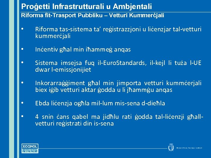 Proġetti Infrastrutturali u Ambjentali Riforma fit-Trasport Pubbliku – Vetturi Kummerċjali • Riforma tas-sistema ta’ reġistrazzjoni u liċenzjar tal-vetturi kummerċjali • Inċentiv għal min iħammeġ anqas • Sistema imsejsa fuq il-Euro. Standards, il-kejl li tuża l-UE dwar l-emissjonijiet • Inkorarraġġiment għal min jimporta vetturi kummċerjali biex iġib vetturi aktar ġodda u li jħammġu anqas • Ebda liċenzja ogħla mil-lum mis-sena d-dieħla • 4 snin ċans qabel ma jidħlu rati ġodda tal-liċenzji għallvetturi reġistrati din is-sena