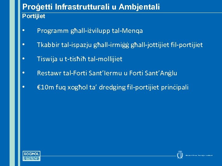 Proġetti Infrastrutturali u Ambjentali Portijiet • Programm għall-iżvilupp tal-Menqa • Tkabbir tal-ispazju għall-irmiġġ għall-jottijiet fil-portijiet • Tiswija u t-tisħiħ tal-mollijiet • Restawr tal-Forti Sant’Iermu u Forti Sant’Anġlu • € 10 m fuq xogħol ta’ dredging fil-portijiet prinċipali