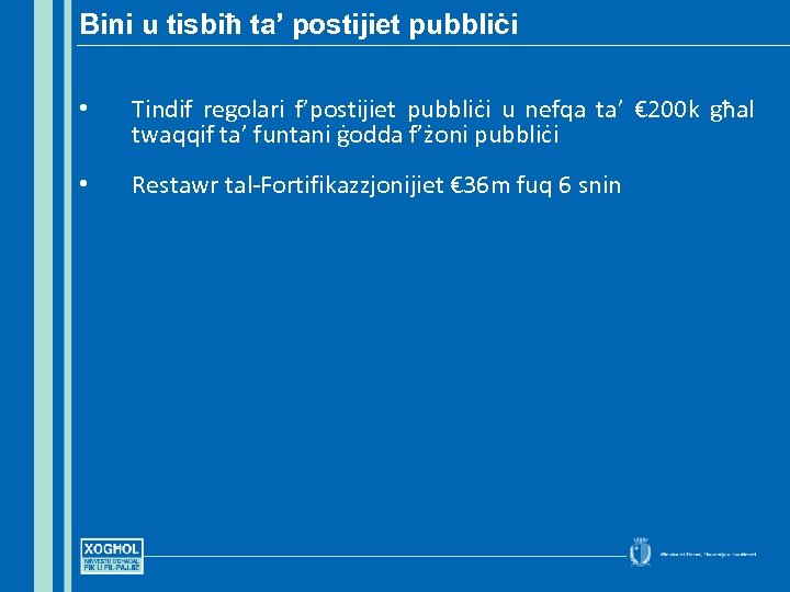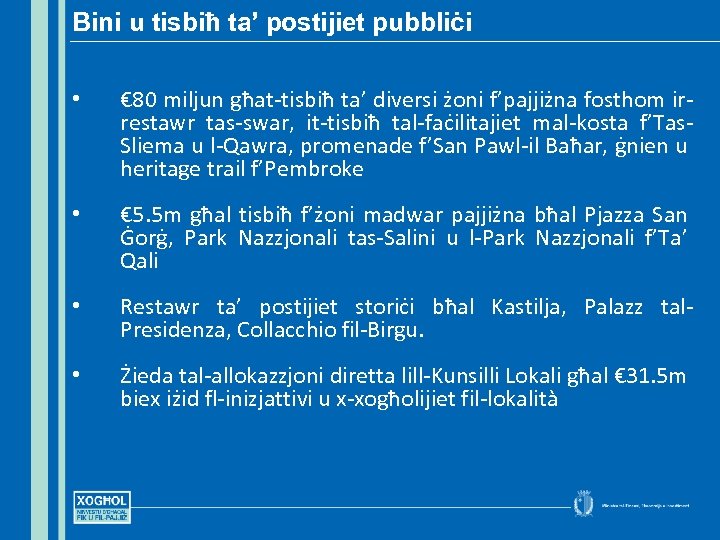 Bini u tisbiħ ta’ postijiet pubbliċi • € 80 miljun għat-tisbiħ ta’ diversi żoni f’pajjiżna fosthom irrestawr tas-swar, it-tisbiħ tal-faċilitajiet mal-kosta f’Tas. Sliema u l-Qawra, promenade f’San Pawl-il Baħar, ġnien u heritage trail f’Pembroke • € 5. 5 m għal tisbiħ f’żoni madwar pajjiżna bħal Pjazza San Ġorġ, Park Nazzjonali tas-Salini u l-Park Nazzjonali f’Ta’ Qali • Restawr ta’ postijiet storiċi bħal Kastilja, Palazz tal. Presidenza, Collacchio fil-Birgu. • Żieda tal-allokazzjoni diretta lill-Kunsilli Lokali għal € 31. 5 m biex iżid fl-inizjattivi u x-xogħolijiet fil-lokalità