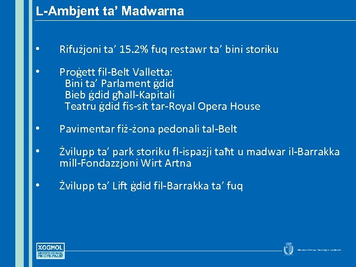 L-Ambjent ta’ Madwarna • Rifużjoni ta’ 15. 2% fuq restawr ta’ bini storiku • Proġett fil-Belt Valletta: Bini ta’ Parlament ġdid Bieb ġdid għall-Kapitali Teatru ġdid fis-sit tar-Royal Opera House • Pavimentar fiż-żona pedonali tal-Belt • Żvilupp ta’ park storiku fl-ispazji taħt u madwar il-Barrakka mill-Fondazzjoni Wirt Artna • Żvilupp ta’ Lift ġdid fil-Barrakka ta’ fuq