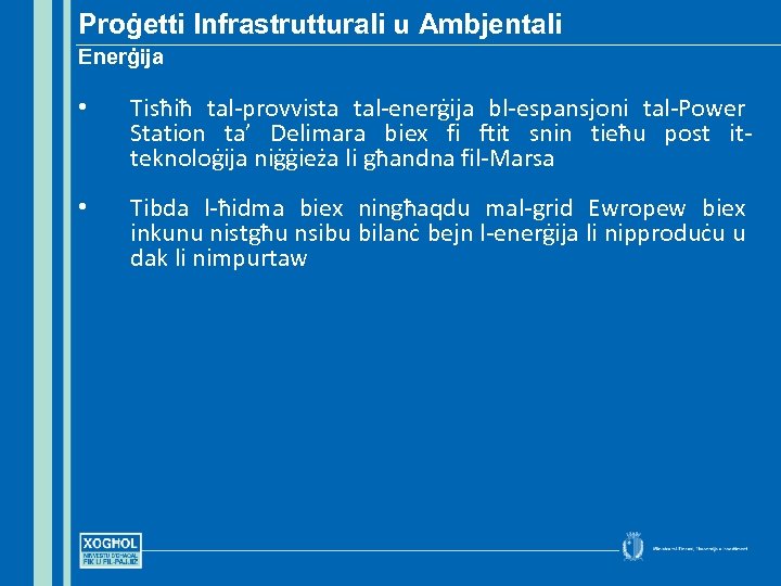 Proġetti Infrastrutturali u Ambjentali Enerġija • Tisħiħ tal-provvista tal-enerġija bl-espansjoni tal-Power Station ta’ Delimara biex fi ftit snin tieħu post itteknoloġija niġġieża li għandna fil-Marsa • Tibda l-ħidma biex ningħaqdu mal-grid Ewropew biex inkunu nistgħu nsibu bilanċ bejn l-enerġija li nipproduċu u dak li nimpurtaw
