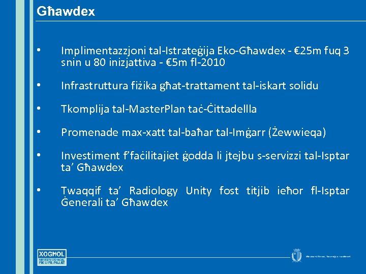 Għawdex • Implimentazzjoni tal-Istrateġija Eko-Għawdex - € 25 m fuq 3 snin u 80 inizjattiva - € 5 m fl-2010 • Infrastruttura fiżika għat-trattament tal-iskart solidu • Tkomplija tal-Master. Plan taċ-Ċittadellla • Promenade max-xatt tal-baħar tal-Imġarr (Żewwieqa) • Investiment f’faċilitajiet ġodda li jtejbu s-servizzi tal-Isptar ta’ Għawdex • Twaqqif ta’ Radiology Unity fost titjib ieħor fl-Isptar Ġenerali ta’ Għawdex