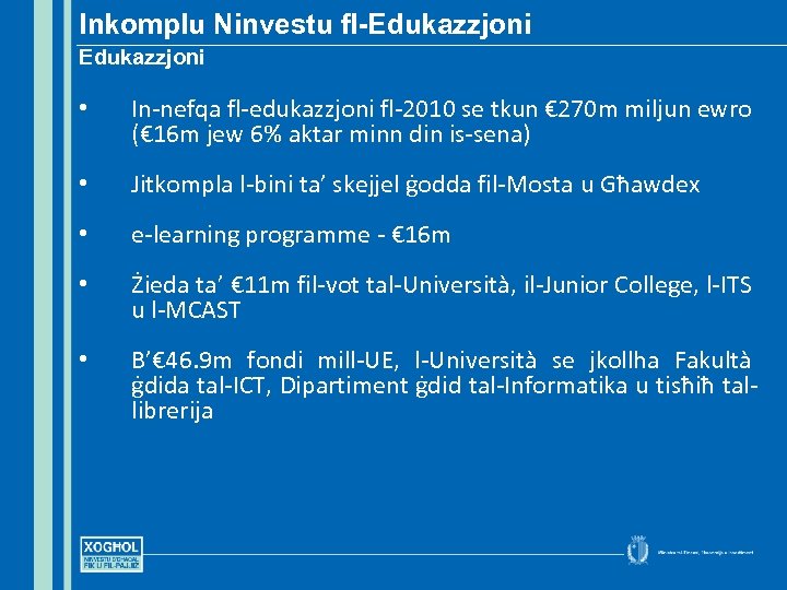 Inkomplu Ninvestu fl-Edukazzjoni • In-nefqa fl-edukazzjoni fl-2010 se tkun € 270 m miljun ewro (€ 16 m jew 6% aktar minn din is-sena) • Jitkompla l-bini ta’ skejjel ġodda fil-Mosta u Għawdex • e-learning programme - € 16 m • Żieda ta’ € 11 m fil-vot tal-Università, il-Junior College, l-ITS u l-MCAST • B’€ 46. 9 m fondi mill-UE, l-Università se jkollha Fakultà ġdida tal-ICT, Dipartiment ġdid tal-Informatika u tisħiħ tallibrerija