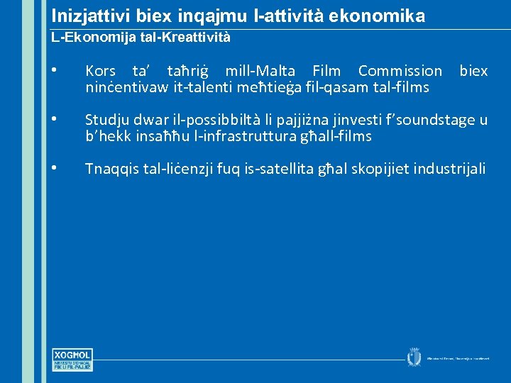 Inizjattivi biex inqajmu l-attività ekonomika L-Ekonomija tal-Kreattività • Kors ta’ taħriġ mill-Malta Film Commission biex ninċentivaw it-talenti meħtieġa fil-qasam tal-films • Studju dwar il-possibbiltà li pajjiżna jinvesti f’soundstage u b’hekk insaħħu l-infrastruttura għall-films • Tnaqqis tal-liċenzji fuq is-satellita għal skopijiet industrijali