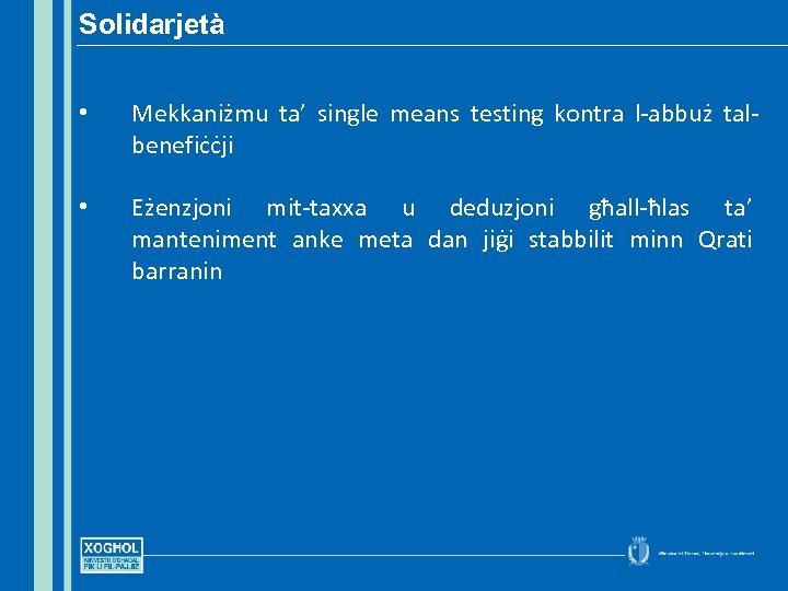 Solidarjetà • Mekkaniżmu ta’ single means testing kontra l-abbuż talbenefiċċji • Eżenzjoni mit-taxxa u deduzjoni għall-ħlas ta’ manteniment anke meta dan jiġi stabbilit minn Qrati barranin