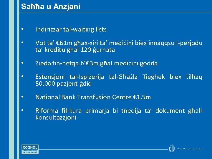 Saħħa u Anzjani • Indirizzar tal-waiting lists • Vot ta’ € 61 m għax-xiri ta’ mediċini biex innaqqsu l-perjodu ta’ kreditu għal 120 ġurnata • Żieda fin-nefqa b’€ 3 m għal mediċini ġodda • Estensjoni tal-Ispiżerija tal-Għażla Tiegħek biex tilħaq 50, 000 pazjent ġdid • National Bank Transfusion Centre € 1. 5 m • Riforma fil-kura primarja bi tnedija ta’ dokument għallkonsultazzjoni