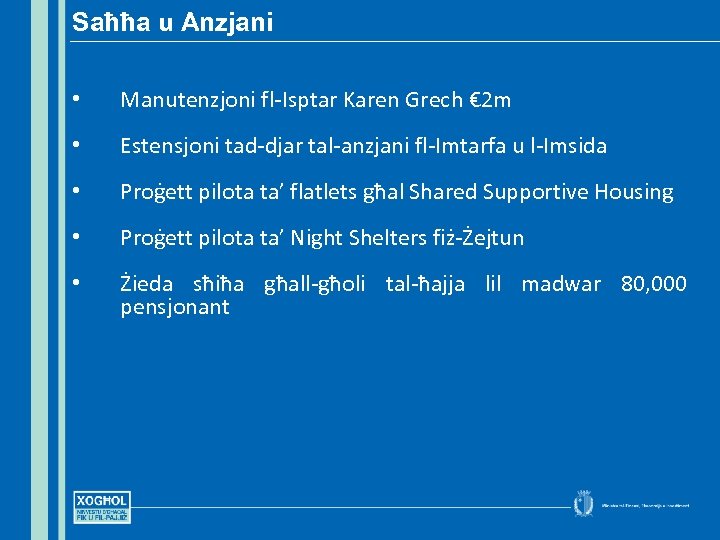 Saħħa u Anzjani • Manutenzjoni fl-Isptar Karen Grech € 2 m • Estensjoni tad-djar tal-anzjani fl-Imtarfa u l-Imsida • Proġett pilota ta’ flatlets għal Shared Supportive Housing • Proġett pilota ta’ Night Shelters fiż-Żejtun • Żieda sħiħa għall-għoli tal-ħajja lil madwar 80, 000 pensjonant