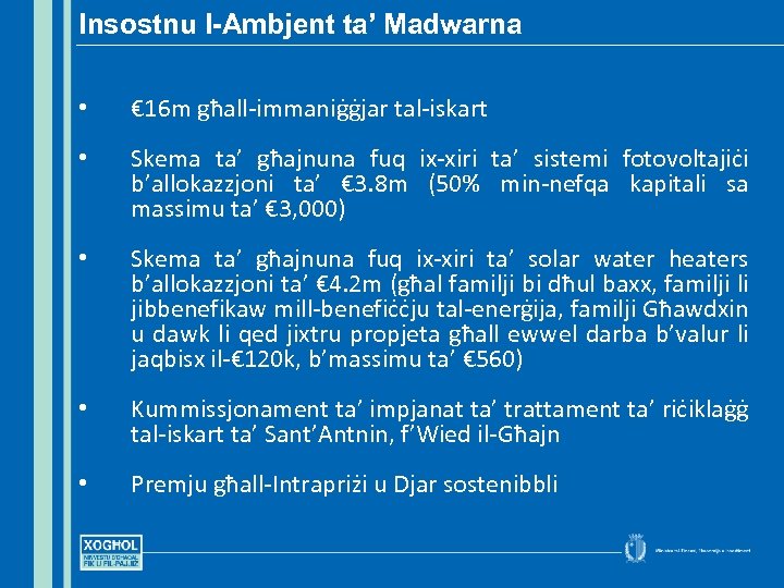 Insostnu l-Ambjent ta’ Madwarna • € 16 m għall-immaniġġjar tal-iskart • Skema ta’ għajnuna fuq ix-xiri ta’ sistemi fotovoltajiċi b’allokazzjoni ta’ € 3. 8 m (50% min-nefqa kapitali sa massimu ta’ € 3, 000) • Skema ta’ għajnuna fuq ix-xiri ta’ solar water heaters b’allokazzjoni ta’ € 4. 2 m (għal familji bi dħul baxx, familji li jibbenefikaw mill-benefiċċju tal-enerġija, familji Għawdxin u dawk li qed jixtru propjeta għall ewwel darba b’valur li jaqbisx il-€ 120 k, b’massimu ta’ € 560) • Kummissjonament ta’ impjanat ta’ trattament ta’ riċiklaġġ tal-iskart ta’ Sant’Antnin, f’Wied il-Għajn • Premju għall-Intrapriżi u Djar sostenibbli