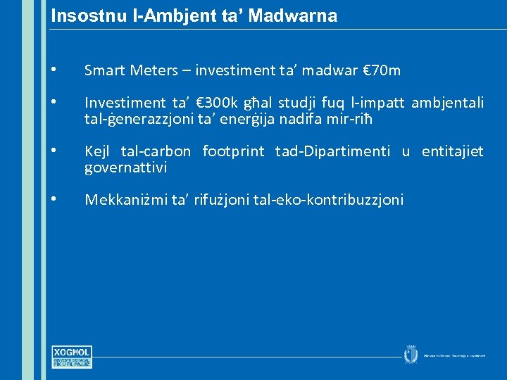 Insostnu l-Ambjent ta’ Madwarna • Smart Meters – investiment ta’ madwar € 70 m • Investiment ta’ € 300 k għal studji fuq l-impatt ambjentali tal-ġenerazzjoni ta’ enerġija nadifa mir-riħ • Kejl tal-carbon footprint tad-Dipartimenti u entitajiet governattivi • Mekkaniżmi ta’ rifużjoni tal-eko-kontribuzzjoni