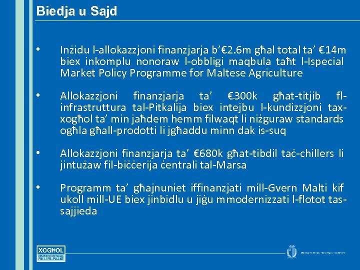 Biedja u Sajd • Inżidu l-allokazzjoni finanzjarja b’€ 2. 6 m għal total ta’ € 14 m biex inkomplu nonoraw l-obbligi maqbula taħt l-Ispecial Market Policy Programme for Maltese Agriculture • Allokazzjoni finanzjarja ta’ € 300 k għat-titjib flinfrastruttura tal-Pitkalija biex intejbu l-kundizzjoni taxxogħol ta’ min jaħdem hemm filwaqt li niżguraw standards ogħla għall-prodotti li jgħaddu minn dak is-suq • Allokazzjoni finanzjarja ta’ € 680 k għat-tibdil taċ-chillers li jintużaw fil-biċċerija ċentrali tal-Marsa • Programm ta’ għajnuniet iffinanzjati mill-Gvern Malti kif ukoll mill-UE biex jinbidlu u jiġu mmodernizzati l-flotot tassajjieda