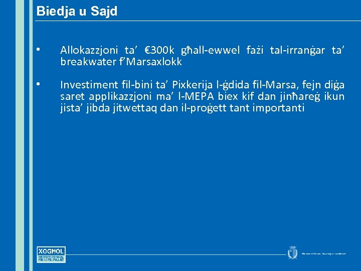 Biedja u Sajd • Allokazzjoni ta’ € 300 k għall-ewwel fażi tal-irranġar ta’ breakwater f’Marsaxlokk • Investiment fil-bini ta’ Pixkerija l-ġdida fil-Marsa, fejn diġa saret applikazzjoni ma’ l-MEPA biex kif dan jinħareġ ikun jista’ jibda jitwettaq dan il-proġett tant importanti