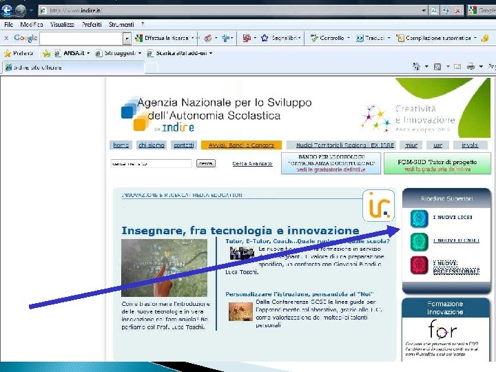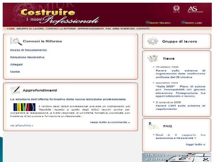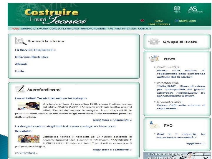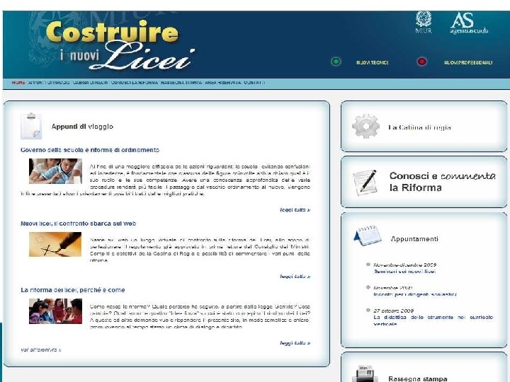 LA COMUNICAZIONE IN RETE Sono stati predisposti 3 distinti siti per ogni indirizzo del riordino delle superiori strutturate in modo simile ma non identico attraverso le quali il pubblico generico acquisisce informazioni sullo stato di avanzamento del riordino; gli utenti istruzione in particolare, possono interagire inviando i propri commenti ai regolamenti in corso di revisione per la seconda lettura. http: //nuovilicei. indire. it, http: //nuovitecnici. indire. it, http: //nuoviprofessionali. indire. it,