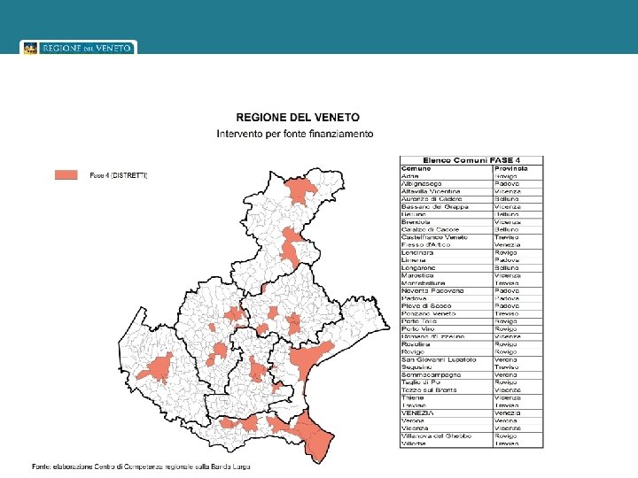 Gli interventi regionali – “backhaul pubblico” • Regione del Veneto ha siglato con il Ministero dello Sviluppo Economico – Dipartimento per le Comunicazioni, un Accordo Quadro e quattro successive Convenzioni operative per lo sviluppo delle infrastrutture di rete sul territorio regionale (DGR n. 2414 del 4 agosto 2009, DGR n. 238/2010 e DGR n. 1753 /2011. • Il progetto prevede la realizzazione di reti pubbliche in fibra ottica (backhauling) che consentiranno di abilitare le reti di accesso di Operatori privati all’erogazione di servizi ad elevata connettività. • L’infrastruttura pubblica sarà a disposizione di tutti gli Operatori TLC