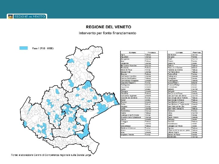 Il Piano di sviluppo della banda larga in Veneto Ottobre 2011 La Giunta Regionale ha approvato Il completamento della prima parte del Piano Regionale per lo sviluppo della Banda Larga che prevede: • 273 interventi/cantieri di posa di fibra ottica • in 188 comuni del veneto • per un investimento complessivo di circa 40 milioni di euro