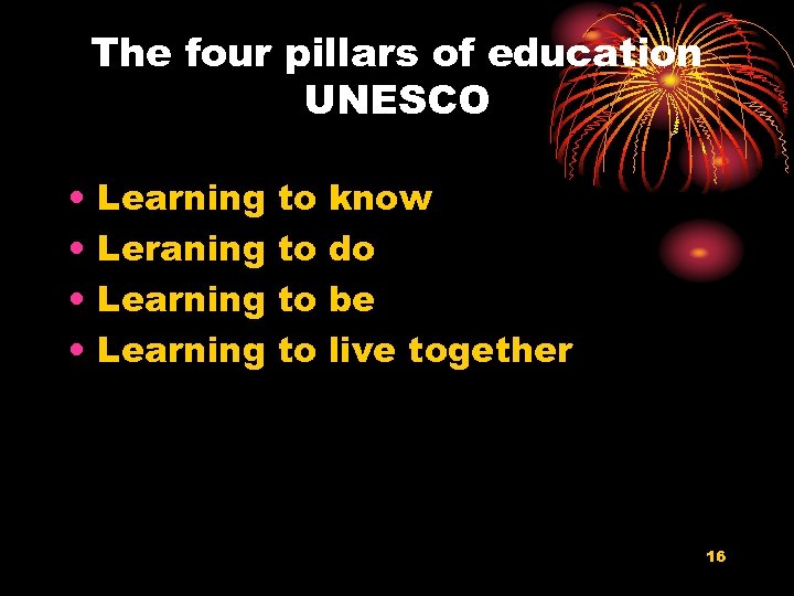 The four pillars of education UNESCO • • Learning Leraning Learning to to know do be live together 16