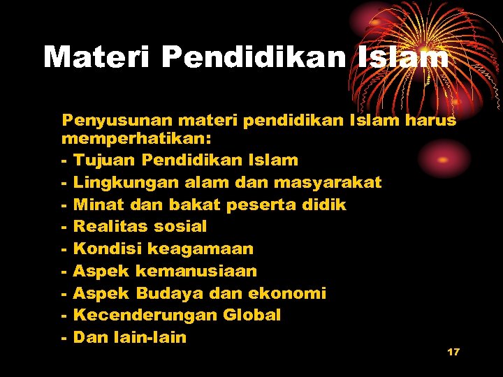 Materi Pendidikan Islam Penyusunan materi pendidikan Islam harus memperhatikan: - Tujuan Pendidikan Islam - Lingkungan alam dan masyarakat - Minat dan bakat peserta didik - Realitas sosial - Kondisi keagamaan - Aspek kemanusiaan - Aspek Budaya dan ekonomi - Kecenderungan Global - Dan lain-lain 17