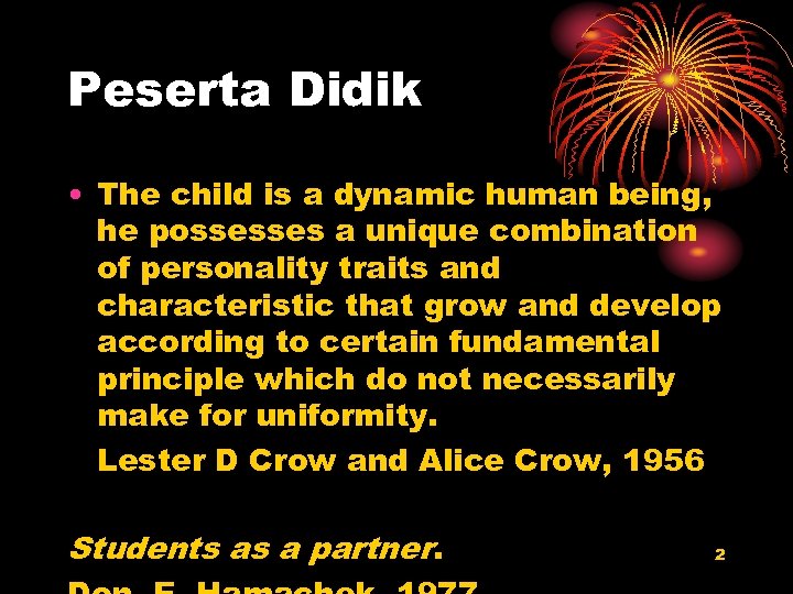 Peserta Didik • The child is a dynamic human being, he possesses a unique combination of personality traits and characteristic that grow and develop according to certain fundamental principle which do not necessarily make for uniformity. Lester D Crow and Alice Crow, 1956 Students as a partner. 2