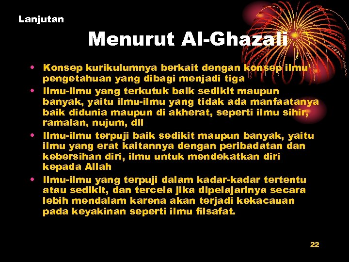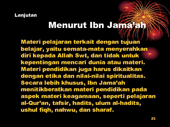 Lanjutan Menurut Al-Ghazali • Konsep kurikulumnya berkait dengan konsep ilmu pengetahuan yang dibagi menjadi tiga • Ilmu-ilmu yang terkutuk baik sedikit maupun banyak, yaitu ilmu-ilmu yang tidak ada manfaatanya baik didunia maupun di akherat, seperti ilmu sihir, ramalan, nujum, dll • Ilmu-ilmu terpuji baik sedikit maupun banyak, yaitu ilmu yang erat kaitannya dengan peribadatan dan kebersihan diri, ilmu untuk mendekatkan diri kepada Allah • Ilmu-ilmu yang terpuji dalam kadar-kadar tertentu atau sedikit, dan tercela jika dipelajarinya secara lebih mendalam karena akan terjadi kekacauan pada keyakinan seperti ilmu filsafat. 22