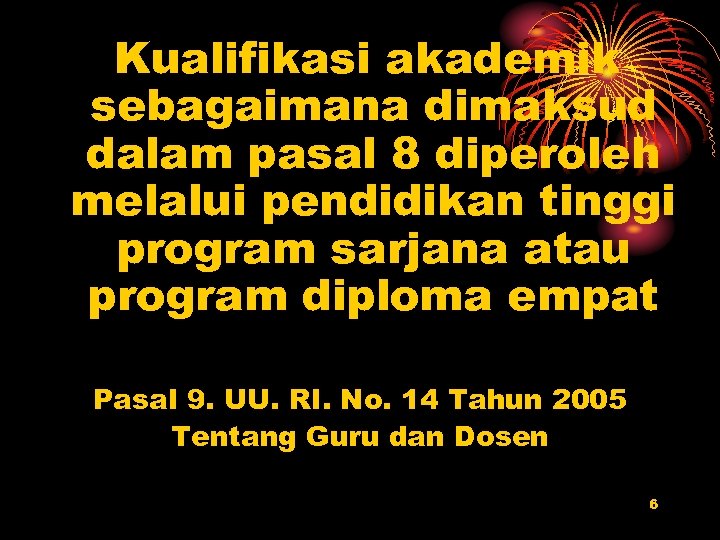 Kualifikasi akademik sebagaimana dimaksud dalam pasal 8 diperoleh melalui pendidikan tinggi program sarjana atau program diploma empat Pasal 9. UU. RI. No. 14 Tahun 2005 Tentang Guru dan Dosen 6