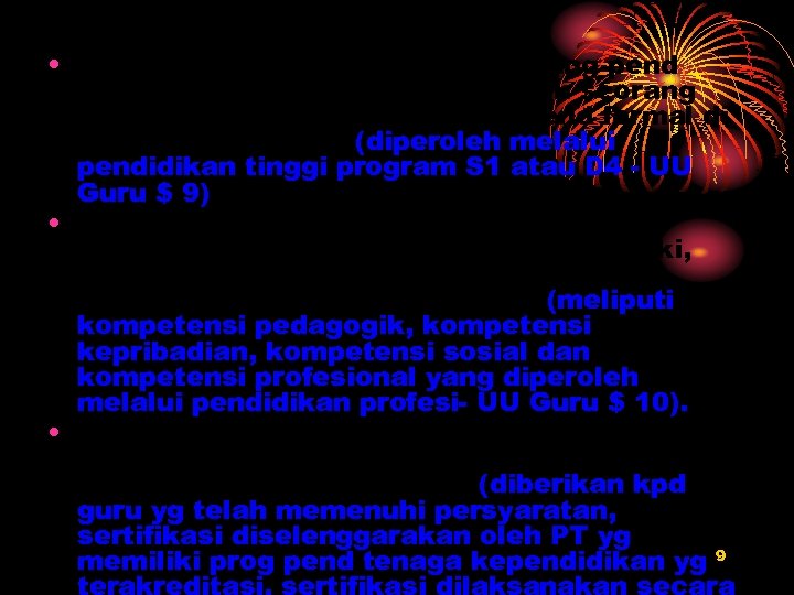 • Kualifikasi akademik: ijazah jenjang pend akademik yang harus dimiliki oleh seorang guru sesuai dg jenis & jenjang pend formal di tempat penugasan (diperoleh melalui pendidikan tinggi program S 1 atau D 4 - UU Guru $ 9) • Kompetensi: seperangkat pengetahuan, keterampilan, & perilaku yg harus dimiliki, dihayati, dan dikuasai oleh guru dalam melaksanakan tugas profesinya (meliputi kompetensi pedagogik, kompetensi kepribadian, kompetensi sosial dan kompetensi profesional yang diperoleh melalui pendidikan profesi- UU Guru $ 10). • Sertifikat pendidik: bukti formal sebagai pengakuan yang diberikan kepada guru sebagai tenaga profesional (diberikan kpd guru yg telah memenuhi persyaratan, sertifikasi diselenggarakan oleh PT yg memiliki prog pend tenaga kependidikan yg 9 terakreditasi, sertifikasi dilaksanakan secara
