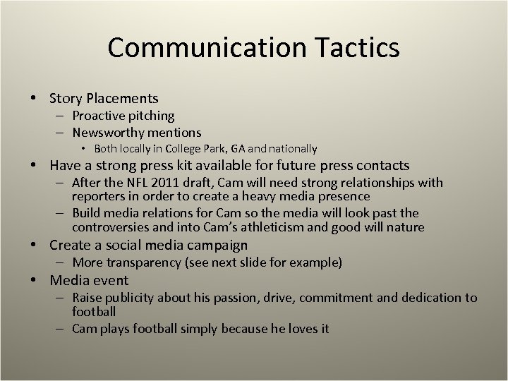 Communication Tactics • Story Placements – Proactive pitching – Newsworthy mentions • Both locally in College Park, GA and nationally • Have a strong press kit available for future press contacts – After the NFL 2011 draft, Cam will need strong relationships with reporters in order to create a heavy media presence – Build media relations for Cam so the media will look past the controversies and into Cam’s athleticism and good will nature • Create a social media campaign – More transparency (see next slide for example) • Media event – Raise publicity about his passion, drive, commitment and dedication to football – Cam plays football simply because he loves it