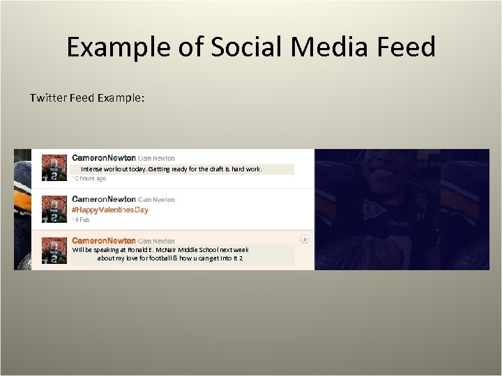 Example of Social Media Feed Twitter Feed Example: Intense workout today. Getting ready for the draft is hard work. Will be speaking at Ronald E. Mc. Nair Middle School next week about my love for football & how u can get into it 2