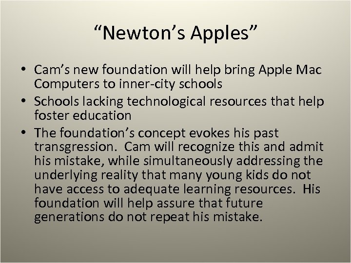“Newton’s Apples” • Cam’s new foundation will help bring Apple Mac Computers to inner-city schools • Schools lacking technological resources that help foster education • The foundation’s concept evokes his past transgression. Cam will recognize this and admit his mistake, while simultaneously addressing the underlying reality that many young kids do not have access to adequate learning resources. His foundation will help assure that future generations do not repeat his mistake.