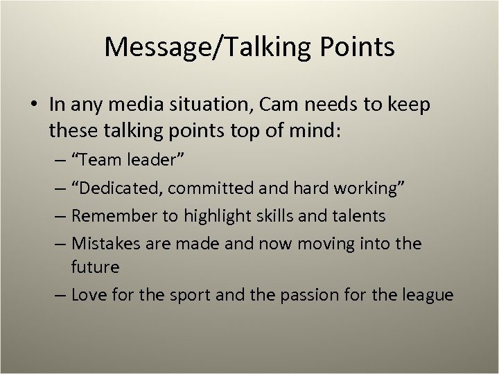 Message/Talking Points • In any media situation, Cam needs to keep these talking points top of mind: – “Team leader” – “Dedicated, committed and hard working” – Remember to highlight skills and talents – Mistakes are made and now moving into the future – Love for the sport and the passion for the league