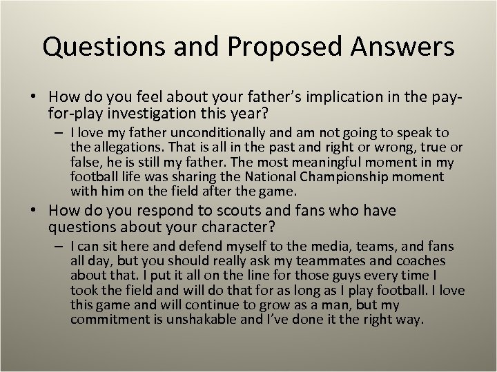 Questions and Proposed Answers • How do you feel about your father’s implication in the payfor-play investigation this year? – I love my father unconditionally and am not going to speak to the allegations. That is all in the past and right or wrong, true or false, he is still my father. The most meaningful moment in my football life was sharing the National Championship moment with him on the field after the game. • How do you respond to scouts and fans who have questions about your character? – I can sit here and defend myself to the media, teams, and fans all day, but you should really ask my teammates and coaches about that. I put it all on the line for those guys every time I took the field and will do that for as long as I play football. I love this game and will continue to grow as a man, but my commitment is unshakable and I’ve done it the right way.