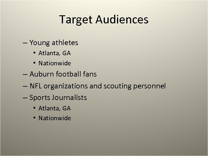 Target Audiences – Young athletes • Atlanta, GA • Nationwide – Auburn football fans – NFL organizations and scouting personnel – Sports Journalists • Atlanta, GA • Nationwide