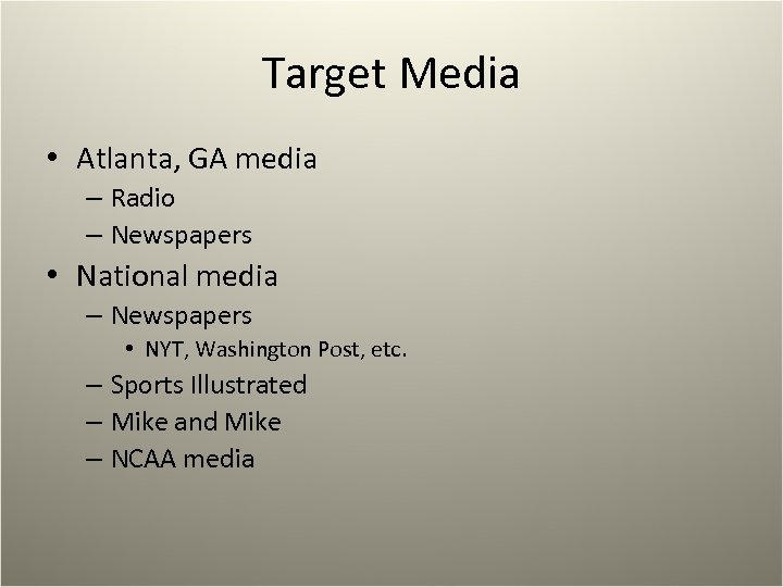Target Media • Atlanta, GA media – Radio – Newspapers • National media – Newspapers • NYT, Washington Post, etc. – Sports Illustrated – Mike and Mike – NCAA media