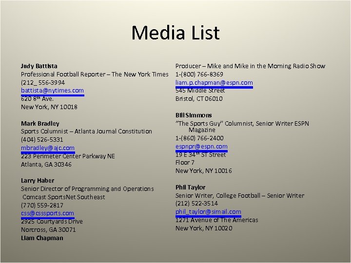 Media List Judy Battista Professional Football Reporter – The New York Times (212_ 556 -3994 battista@nytimes. com 620 8 th Ave. New York, NY 10018 Mark Bradley Sports Columnist – Atlanta Journal Constitution (404) 526 -5331 mbradley@ajc. com 223 Perimeter Center Parkway NE Atlanta, GA 30346 Larry Haber Senior Director of Programming and Operations Comcast Sports. Net Southeast (770) 559 -2817 css@csssports. com 2925 Courtyards Drive Norcross, GA 30071 Liam Chapman Producer – Mike and Mike in the Morning Radio Show 1 -(800) 766 -8369 liam. p. chapman@espn. com 545 Middle Street Bristol, CT 06010 Bill Simmons “The Sports Guy” Columnist, Senior Writer ESPN Magazine 1 -(860) 766 -2400 espnpr@espn. com 19 E 34 th ST Street Floor 7 New York, NY 10016 Phil Taylor Senior Writer, College Football – Senior Writer (212) 522 -3514 phil_taylor@simail. com 1271 Avenue of The Americas New York, NY 10020