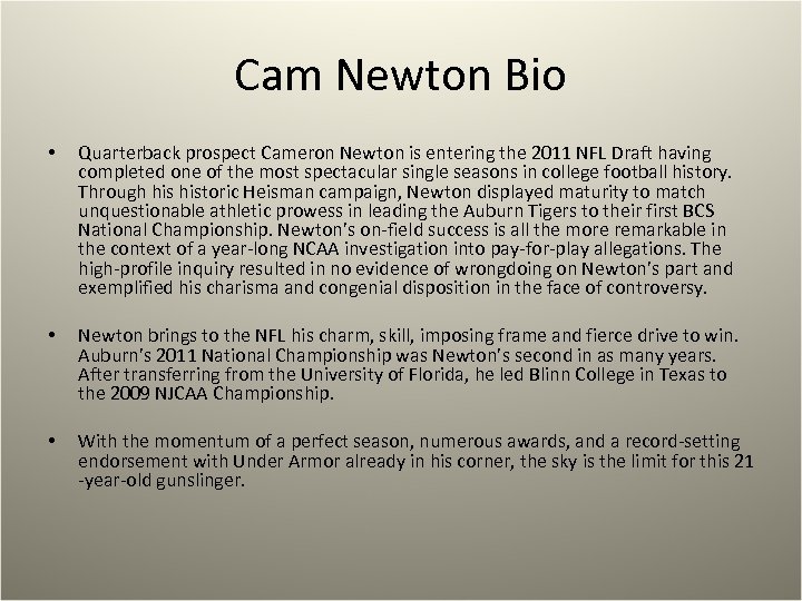 Cam Newton Bio • Quarterback prospect Cameron Newton is entering the 2011 NFL Draft having completed one of the most spectacular single seasons in college football history. Through historic Heisman campaign, Newton displayed maturity to match unquestionable athletic prowess in leading the Auburn Tigers to their first BCS National Championship. Newton’s on-field success is all the more remarkable in the context of a year-long NCAA investigation into pay-for-play allegations. The high-profile inquiry resulted in no evidence of wrongdoing on Newton’s part and exemplified his charisma and congenial disposition in the face of controversy. • Newton brings to the NFL his charm, skill, imposing frame and fierce drive to win. Auburn’s 2011 National Championship was Newton’s second in as many years. After transferring from the University of Florida, he led Blinn College in Texas to the 2009 NJCAA Championship. • With the momentum of a perfect season, numerous awards, and a record-setting endorsement with Under Armor already in his corner, the sky is the limit for this 21 -year-old gunslinger.
