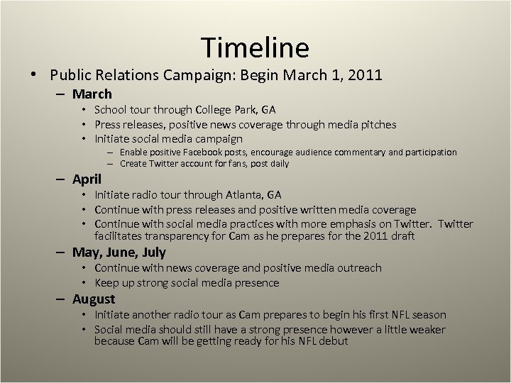 Timeline • Public Relations Campaign: Begin March 1, 2011 – March • School tour through College Park, GA • Press releases, positive news coverage through media pitches • Initiate social media campaign – April – Enable positive Facebook posts, encourage audience commentary and participation – Create Twitter account for fans, post daily • Initiate radio tour through Atlanta, GA • Continue with press releases and positive written media coverage • Continue with social media practices with more emphasis on Twitter facilitates transparency for Cam as he prepares for the 2011 draft – May, June, July • Continue with news coverage and positive media outreach • Keep up strong social media presence – August • Initiate another radio tour as Cam prepares to begin his first NFL season • Social media should still have a strong presence however a little weaker because Cam will be getting ready for his NFL debut