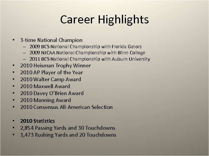Career Highlights • 3 -time National Champion – 2009 BCS National Championship with Florida Gators – 2009 NJCAA National Championship with Blinn College – 2011 BCS National Championship with Auburn University • • 2010 Heisman Trophy Winner 2010 AP Player of the Year 2010 Walter Camp Award 2010 Maxwell Award 2010 Davey O’Brien Award 2010 Manning Award 2010 Consensus All-American Selection • 2010 Statistics • 2, 854 Passing Yards and 30 Touchdowns • 1, 473 Rushing Yards and 20 Touchdowns