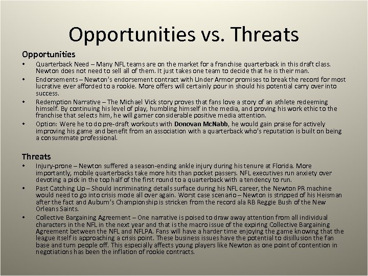 Opportunities vs. Threats Opportunities • • Quarterback Need – Many NFL teams are on the market for a franchise quarterback in this draft class. Newton does not need to sell all of them. It just takes one team to decide that he is their man. Endorsements – Newton’s endorsement contract with Under Armor promises to break the record for most lucrative ever afforded to a rookie. More offers will certainly pour in should his potential carry over into success. Redemption Narrative – The Michael Vick story proves that fans love a story of an athlete redeeming himself. By continuing his level of play, humbling himself in the media, and proving his work ethic to the franchise that selects him, he will garner considerable positive media attention. Option: Were he to do pre-draft workouts with Donovan Mc. Nabb, he would gain praise for actively improving his game and benefit from an association with a quarterback who’s reputation is built on being a consummate professional. Threats • • • Injury-prone – Newton suffered a season-ending ankle injury during his tenure at Florida. More importantly, mobile quarterbacks take more hits than pocket passers. NFL executives run anxiety over devoting a pick in the top half of the first round to a quarterback with a tendency to run. Past Catching Up – Should incriminating details surface during his NFL career, the Newton PR machine would need to go into crisis mode all over again. Worst case scenario – Newton is stripped of his Heisman after the fact and Auburn’s Championship is stricken from the record ala RB Reggie Bush of the New Orleans Saints. Collective Bargaining Agreement – One narrative is poised to draw away attention from all individual characters in the NFL in the next year and that is the macro issue of the expiring Collective Bargaining Agreement between the NFL and NFLPA. Fans will have a harder time enjoying the game knowing that the league itself is approaching a crisis point. These business issues have the potential to disillusion the fan base and turn people off. This especially affects young players like Newton as one point of contention in negotiations has been the inflation of rookie contracts.