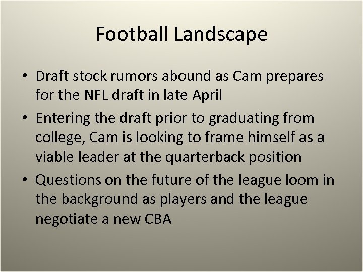 Football Landscape • Draft stock rumors abound as Cam prepares for the NFL draft in late April • Entering the draft prior to graduating from college, Cam is looking to frame himself as a viable leader at the quarterback position • Questions on the future of the league loom in the background as players and the league negotiate a new CBA
